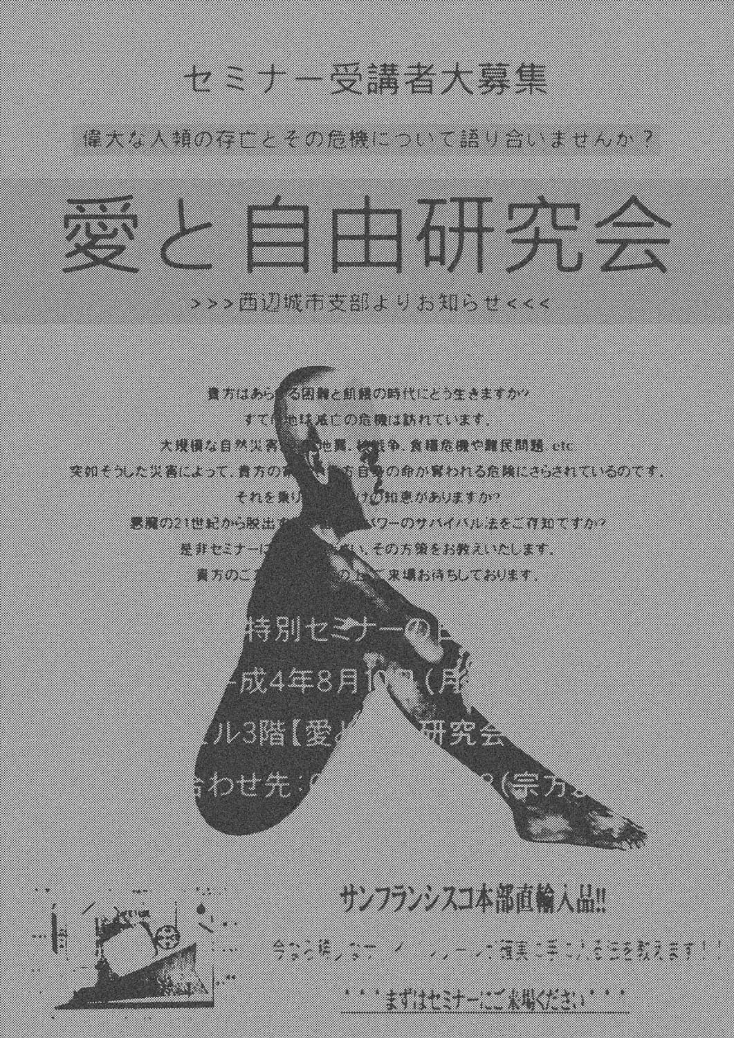 あのさ、昔、駅前の青っぽいビルでさ、小山内塾って高校受験のための中学生が通う塾があったじゃん? あそこのビルの3階で、「愛と自由研究会」のセミナーやってたらしいよ。