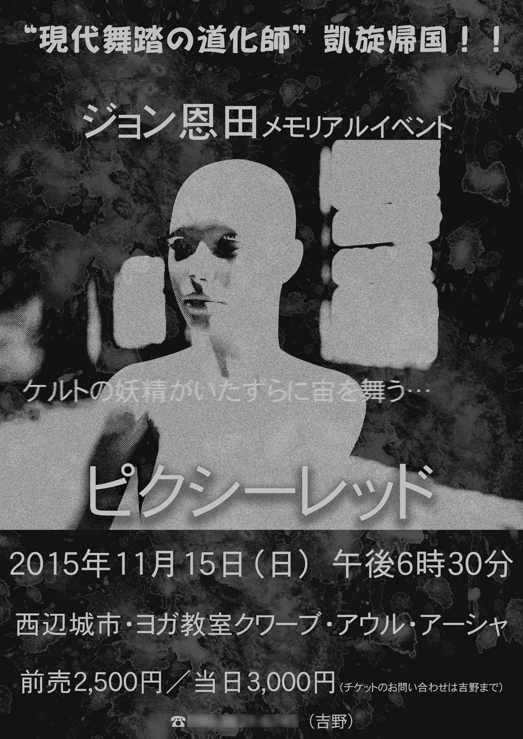 「そうそう、やったよな。あそこで、青燐光の野外公演があって、オレとかニシとか木戸が見に行ったんだけどさ。なんていうか恩田さん、あの公演でとんでもないことになって。青燐光はあれでほとんど終わっちゃって、その後、恩田さんは、現代舞踏学ぶためにドイツに留学して、それからニューヨークに移って、ブロードウェイのオフオフなんかで、舞踏のパフォーマンスをアルバイトしながらやってたらしいんだよ。ずっと向こうで住んでてね。そんで久しぶりに帰ってきて来月、市内のヨガ教室で、恩田さんの引退記念のイベントがあるんだよ。あ、これ、フライヤーね。『ピクシーレッド』っていう…。こういう感じのイベントなんだけどね」